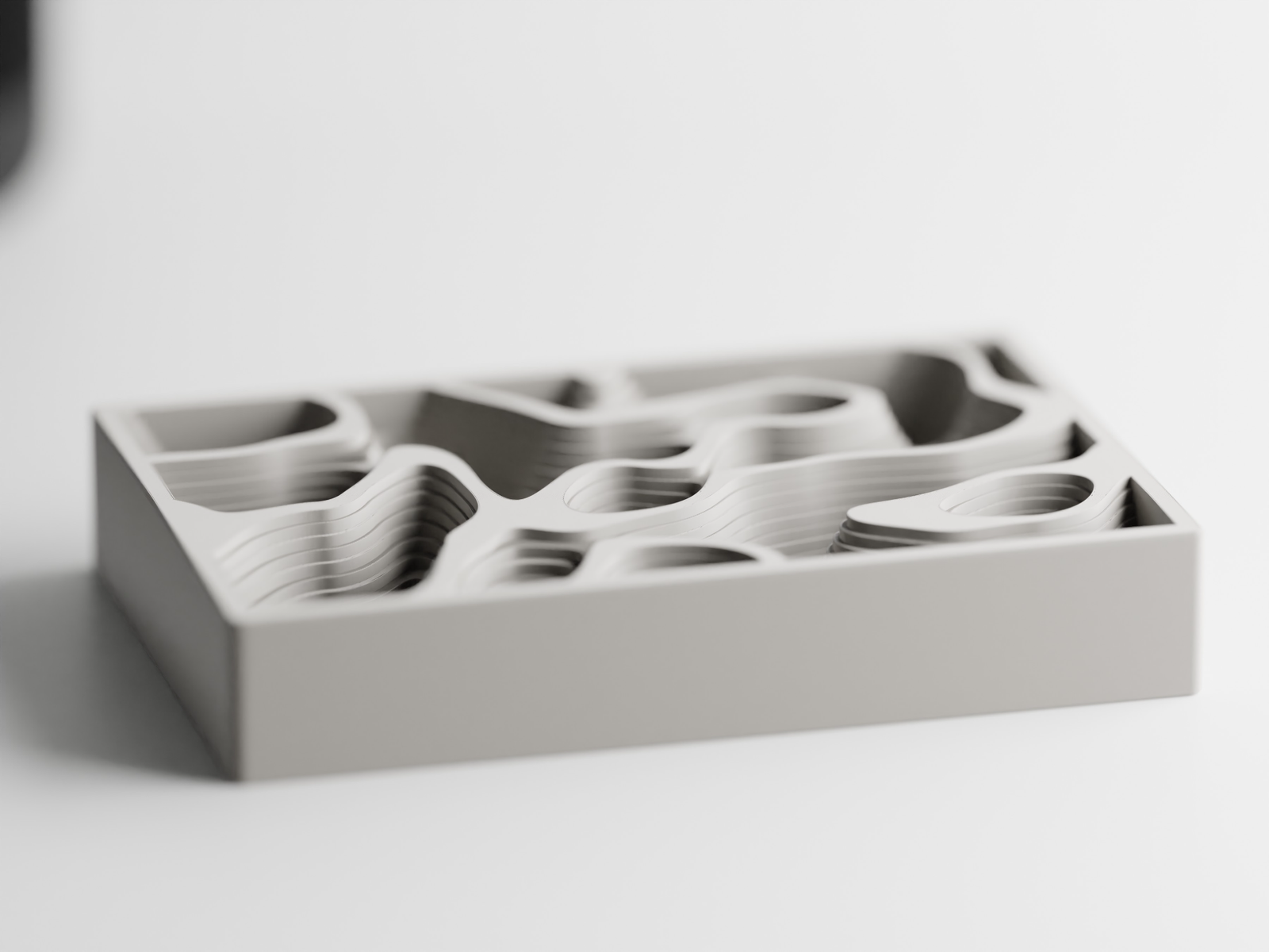 This 3D-printed tray features a stepped design with compartments in various sizes, perfect for keeping jewelry, accessories, or other small items neatly sorted.The different-sized indents offer flexibility for organizing items of all shapes and sizes.
