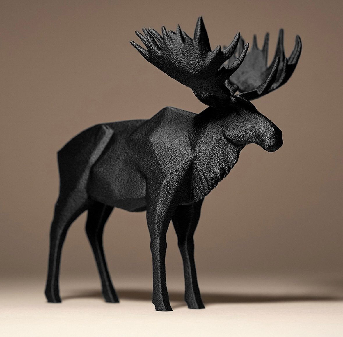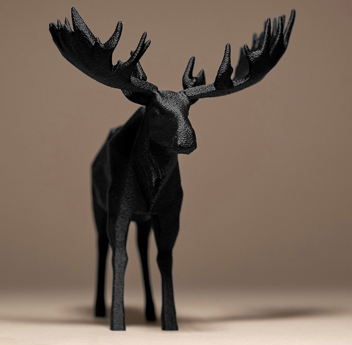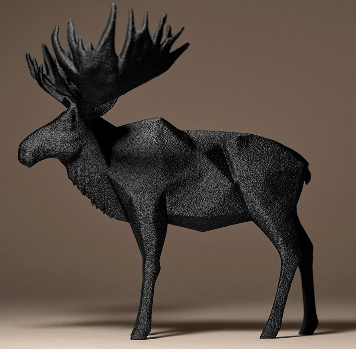 Command the room with the majestic silhouette of this geometric moose sculpture. Featuring an imposing set of broad, textured antlers, this piece captures the quiet power of the northern wild through a clean, architectural lens. Its finish absorbs light beautifully, highlighting the rugged strength of the animal while maintaining a sophisticated, high-design feel that grounds any office, lodge-style living room, or modern entryway.
